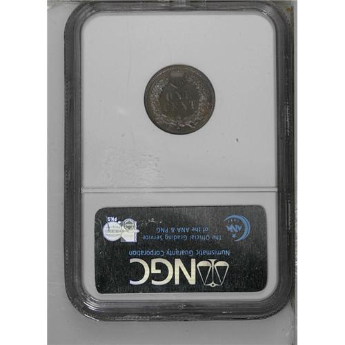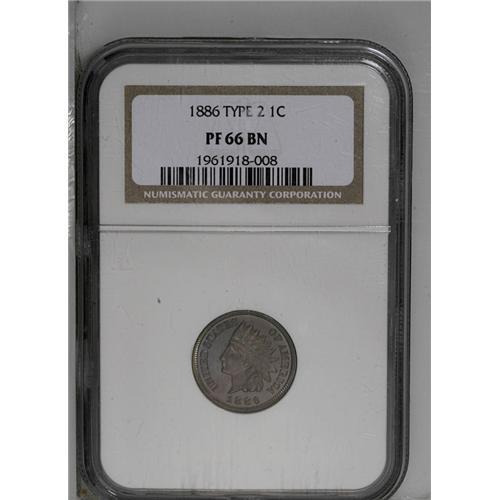 <B>1886<1C> Type Two PR66 Brown NGC.</B></I> The fields are an even, deep brown with a blue cast, while the devices are slightly lighter. The bottom feather, intricately detailed like the rest of the coin, points between the C and A of AMERICA.
