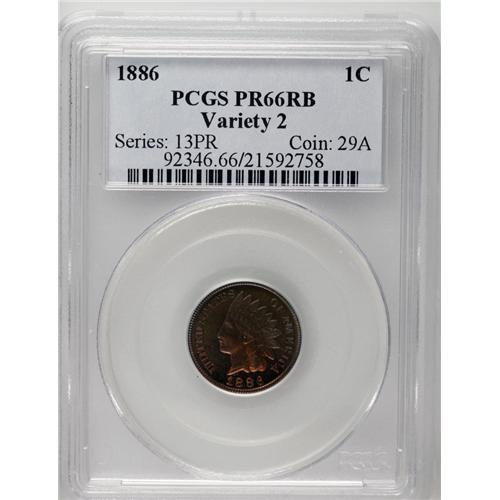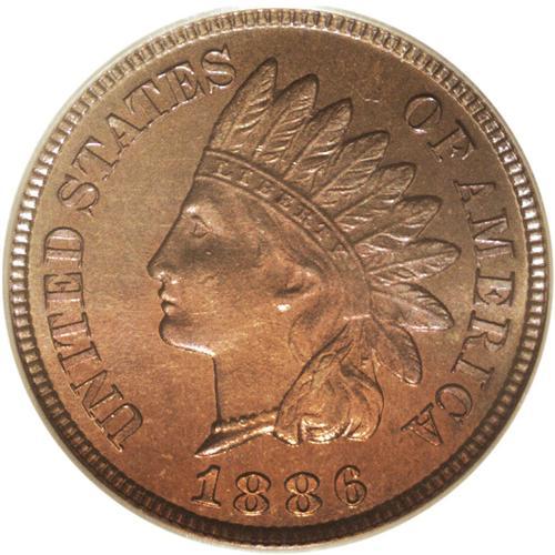 <B>1886<1C> Type Two PR66 Red and Brown PCGS.</B></I> The Type Two 1886 Indian cents, with lowest feather between CA in AMERICA, are much, much rarer than the Type Ones, with the feather between IC. This two-toned example is purplish-red on the top and brilliant sunset-orange on the bottom, with the reverse purplish-blue. This example boasts a razor-sharp strike with minimal evidence of contact. This example is the highest at PCGS within the Red and Brown color designation, and tied with three others for finest within any color designation at that service (7/06).