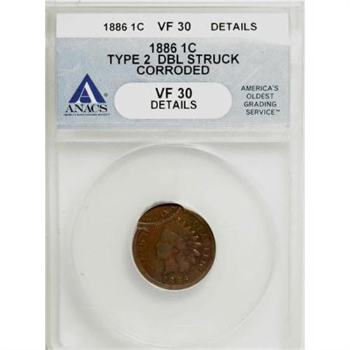 <B>1886 1C Indian Cent, Type Two--Corroded, Double Struck--ANACS. VF30 Details.</B></I> <BR><BR><B>Coin Engraver:</B> James B. Longacre<BR><BR><b>Shipping:</b> Coins & Currency (<a target="_blank" href="http://www.heritageauctions.com/common/shipping.php">view shipping information</a>)