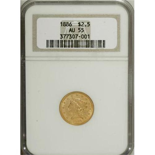 <B>1886 $2 1/2 AU55 NGC.</B></I> NGC Census: (9/98). PCGS Population (25/58). Mintage: 4,000. Numismedia Wsl. Price for NGC/PCGS coin in AU55: $565. (#7838)<BR><BR><B>Coin Engraver:</B> Christian Gobrecht<BR><BR><b>Shipping:</b> Coins & Currency (<a target="_blank" href="http://www.heritageauctions.com/common/shipping.php">view shipping information</a>\)