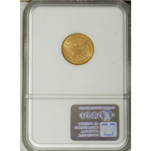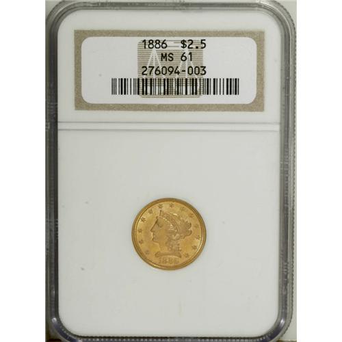 <B>1886 $2 1/2 MS61 NGC.</B></I> The golden-orange surfaces of this Mint State example display well-distributed light to moderate abrasions. This softly lustrous quarter eagle is one of just 4,000 pieces coined. Census: 20 in 61, 34 finer (11/06).<BR><BR><b>Shipping:</b> Coin/Currency (<a target="_blank" href="http://www.heritageauctions.com/common/shipping.php">view shipping information</a>)