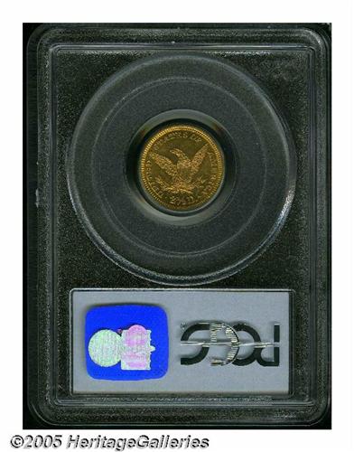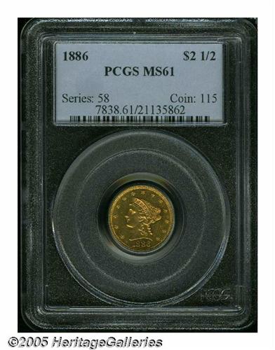 <B>1886<$2 1/2> MS61 PCGS.</B></I> Boldly struck with some prooflike tendencies on both sides. Very attractive orange-gold patina clings to lustrous surfaces that display some wispy handling marks, which are not overly detractive. This scarce issue boasts a mintage of just 4,000 pieces. Population: 9 in 61, 24 finer (3/05).