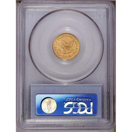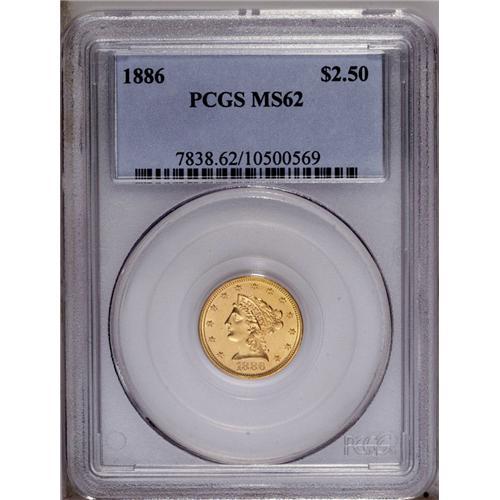 <B>1886<$2 1/2> MS62 PCGS.</B></I> This sharply struck and bright scarce date quarter eagle has a light vertical mark on the neck but is generally clean for the grade. A scant 4,000 pieces were struck. Population: 12 in 62, 14 finer (3/06).