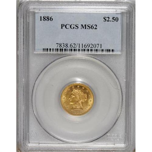 <B>1886 $2 1/2 MS62 PCGS.</B></I> A flashy and unworn butter-yellow representative of this low-mintage issue, one of just 4,000 pieces struck. Solidly struck with a degree of reflectivity in the fields and scattered, grade-defining abrasions. Population: 13 in 62, 14 finer (4/07).<BR><BR><b>Shipping:</b> Coins & Currency (<a target="_blank" href="http://www.heritageauctions.com/common/shipping.php">view shipping information</a>)