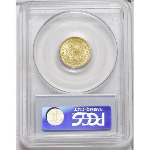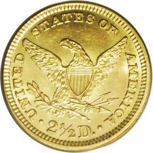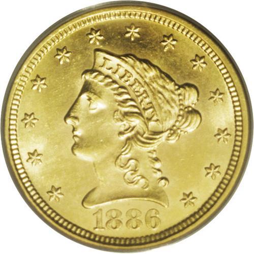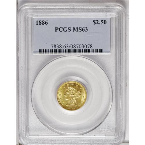 <B>1886<$2 1/2> MS63 PCGS.</B></I> From a minuscule emission of only 4,000 examples comes this charming coin, with delectable honey-gold surfaces that are considerably prooflike. There are a few faint abrasions seen under a loupe, but they are undistracting. Beautiful luster and superior eye appeal are this coin's chief characteristics.<BR><I>From The Della Collection.</B></I>