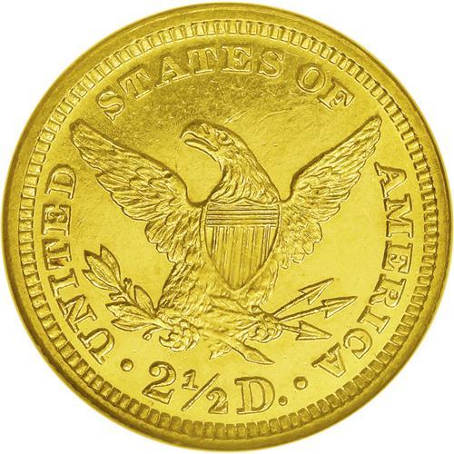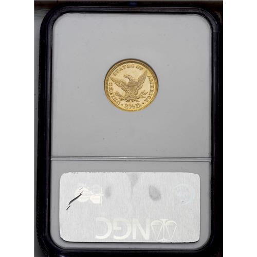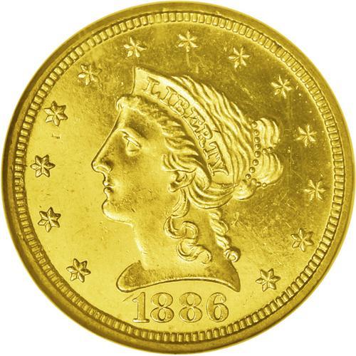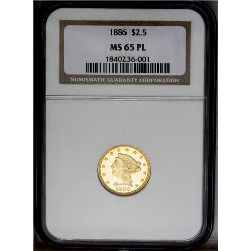 <B>1886<$2 1/2> MS65 Prooflike NGC.</B></I> An extremely rare and seldom-offered date, with a meager business strike mintage of 4,000 pieces. This example is sharply struck at the centers, and the dies still retain some polish in the fields, a phenomenon that creates the prooflike mirror fields even on business strikes. The die polish normally wears away as more coins are struck. But, given that the mintage for this issue was so tiny, a few of the remaining Mint State pieces show this reflectivity. This specimen shows a minor nick above the 1 in the date, just below the truncation. Perusal with a loupe reveals only some minor field hairlines on this stunning Gem. This is the only example designated Gem Prooflike at either service (6/06).<BR><I>From The New York Eye Appeal Collection.</B></I>