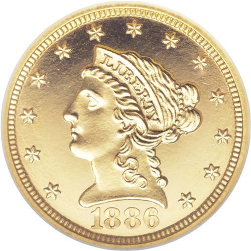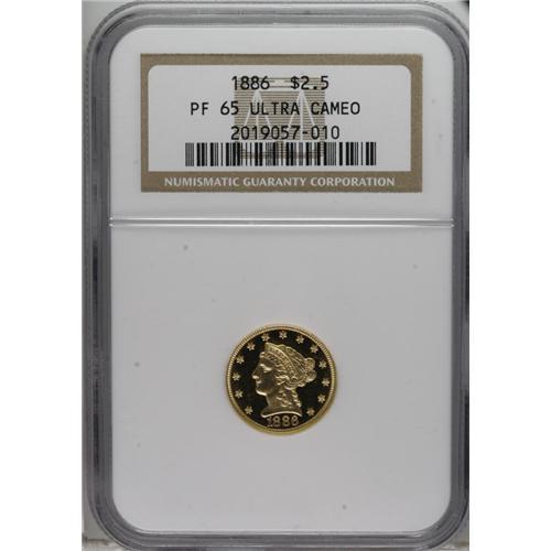 <B>1886 $2 1/2 PR65 Ultra Cameo NGC.</B></I> A rarity in the proof gold series, from a mintage of just 88 coins, with only about 30 to 40 examples still existing today. Only another 4,000 business strikes were struck during the year, thus 1886 is actually an important quarter eagle rarity in any production format. This piece is an amazing Gem with exceptional contrast between the highly lustrous devices and the deeply mirrored yellow-gold fields. The surfaces are nearly flawless and present the usual watery appearance that is common to all proof gold coins of this era. Both sides are fully brilliant and present exceptional eye appeal. Census: 5 in 65, 4 finer (3/07).<BR><BR><b>Shipping:</b> Coins & Currency (<a target="_blank" href="http://www.heritageauctions.com/common/shipping.php">view shipping information</a>)
