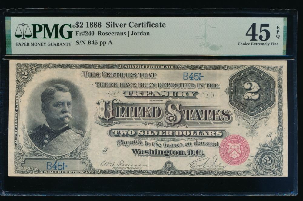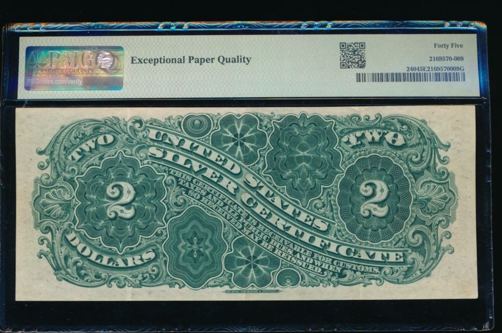 One 1886 $2 Low Serial Silver Certificate PMG 45EPQ.