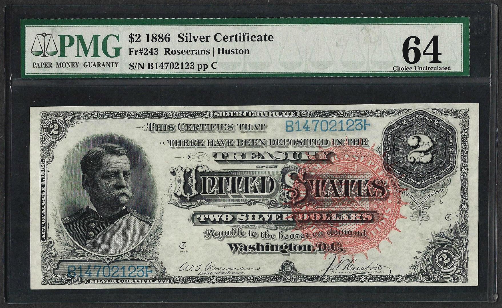 One 1886 $2 Silver Certificate Note Fr.243 PMG Choice Uncirculated 64. PMG Certified.
