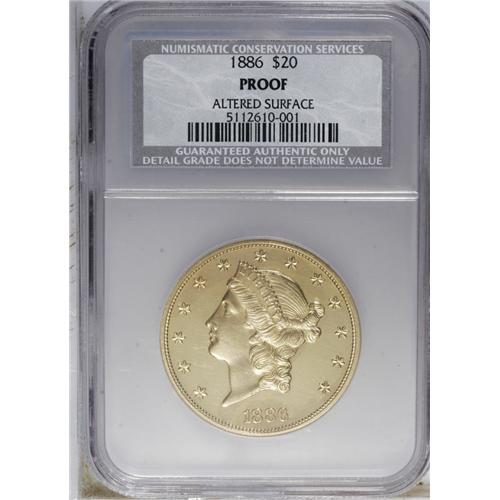 <B>1886 $20 --Altered Surface--NCS. Proof.</B></I> The 1886 is the stopper to a date set of Liberty double eagles. For whatever reason, San Francisco neglected to strike 1886-S twenties, the only such omission by the Mint between 1854 and 1911. Only the Philadelphia Mint coined the denomination in 1886, but just 1,000 business strikes and 106 proofs were issued. Among these proofs, many are impaired or no longer exist. NGC has certified just 20 pieces across all grades, some of which are presumably resubmissions.<BR> This razor-sharp specimen has noticeable cameo frost. Study beneath a lens indicates a few light hairlines. A subtle color change on the field, between gold and faint mauve, occurs near the eagle, arrowheads, neck curls, and obverse stars 4 to 6. This color change may have triggered the Altered Surface designation, although its impact is best measured through personal inspection, which is recommended. It is certain the piece would be a highlight of many advanced collections.<BR><BR><b>Shipping:</b> Coin/Currency (<a target="_blank" href="http://www.heritageauctions.com/common/shipping.php">view shipping information</a>)