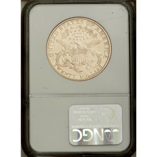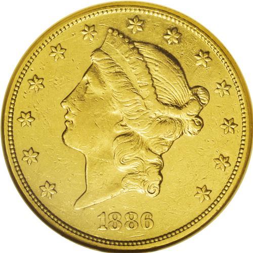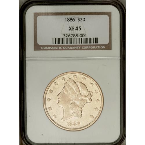 <B>1886<$20> XF45 NGC.</B></I> A very rare Type Three double eagle that is seldom seen in any grade. Part of a seven-year run from 1881 to 1887 of rare Philadelphia double eagle issues that saw either extremely limited production of business strikes or no circulation coinage at all, as was the case for the Proof-only issues of 1883, 1884, and 1887. Only 1,000 business strikes were produced of the 1886, and today no more than a few dozen exist. The fields are fairly bright, with remnants of the prooflike reflectivity usually seen. Moderately abraded on each side and lightly, if evenly worn for the grade. Sure to be of interest to the many collectors of Liberty double eagles.<BR><I>From The New York Eye Appeal Collection.</B></I>