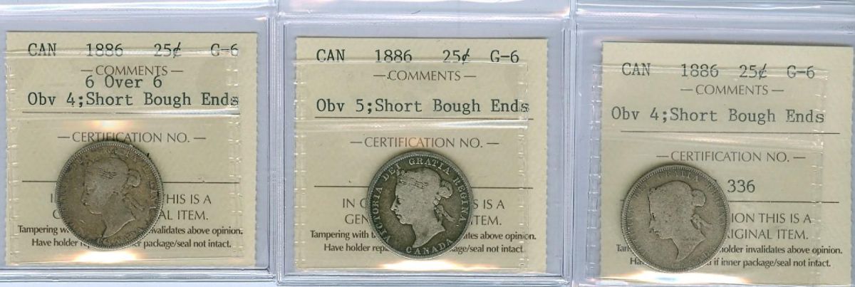 1886 25¢. Lot of 3 ICCS G6 coins includes Obv 4 Short bough ends, Obv 5 Short bough ends and Obv 4 Short bough ends 6 over 6.