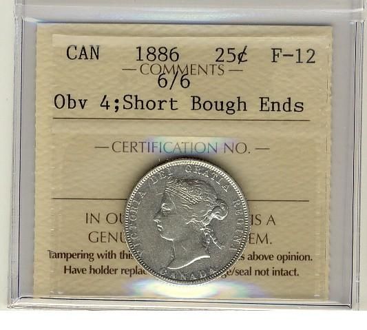 1886 25¢ Obv 4, 6/6 Short Bough Ends ICCS F12.
