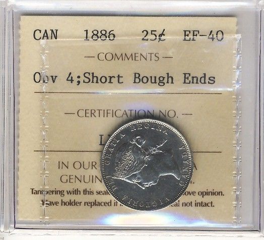 1886 25¢ Obv 4 Short Bough Ends ICCS EF40. Tough date.