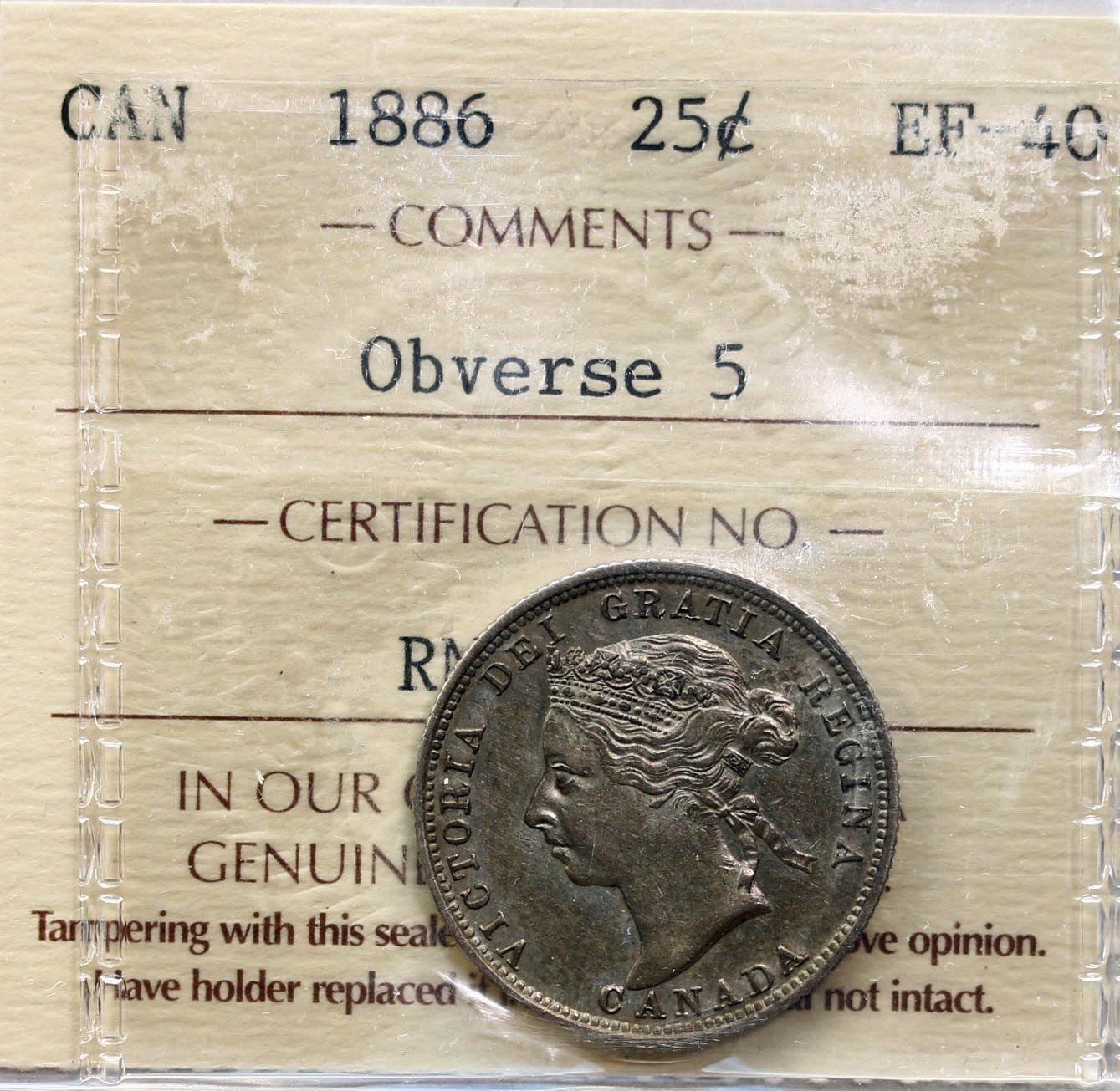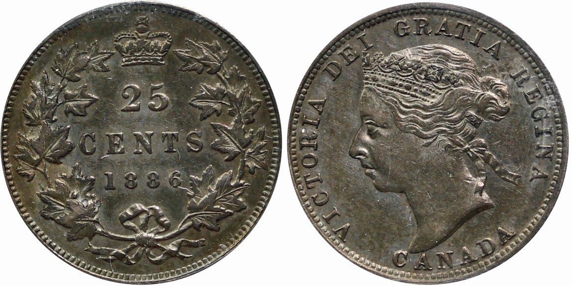 1886 25¢ Obv 5 ICCS Extra Fine-40. A better date example with greyish tints.