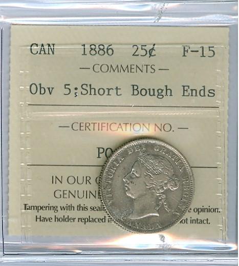 1886 25¢ Obv. 5 Short bough ends ICCS F15.