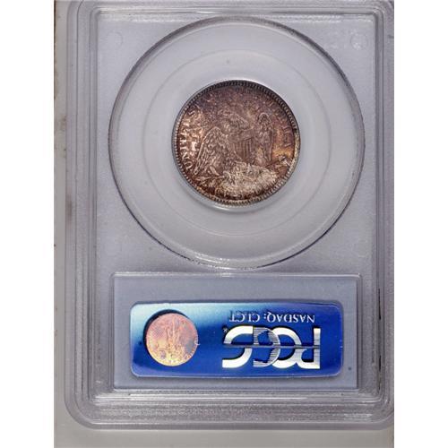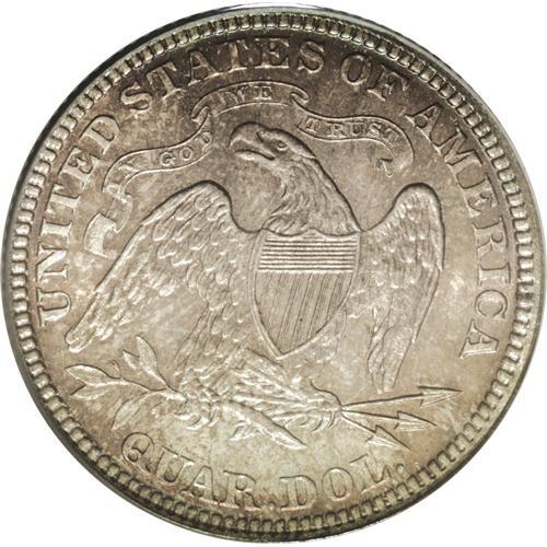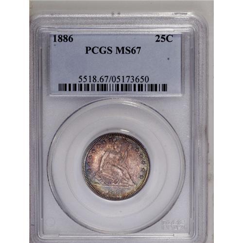 <B>1886<25C> MS67 PCGS.</B></I> Rich orange-red and aquamarine patina endows this lustrous high grade Seated quarter. The strike is formidable except for the BER in LIBERTY, which were weakened on the die from a mint worker's polishing. Gorgeously smooth fields further confirm the Superb assessment. The 1886 is the lowest mintage P-mint Seated quarter. Just 5,000 business strikes and 886 proofs were delivered.