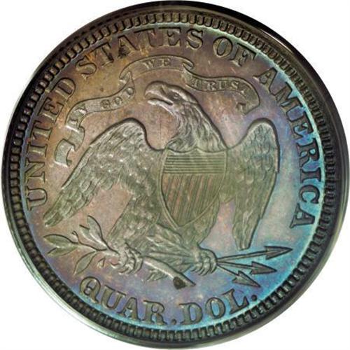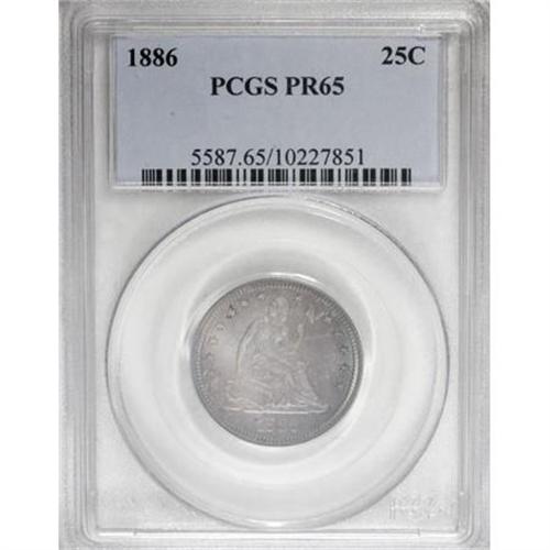 <B>1886 25C PR65 PCGS.</B></I> Both obverse and reverse of this Gem proof quarter are well matched with light to medium intensity electric-blue, violet, and golden-brown patination. A few grade-consistent marks on the obverse are not bothersome. All of the design features are sharply struck. Population: 33 in 65, 37 finer (11/07).<BR><BR><B>Coin Engraver:</B> Christian Gobrecht<BR><BR><b>Shipping:</b> Coins & Currency (<a target="_blank" href="http://www.heritageauctions.com/common/shipping.php">view shipping information</a>)