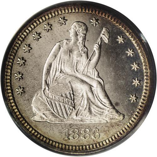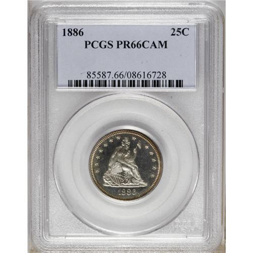 <B>1886<25C> PR66 Cameo PCGS.</B></I> Icy devices rise above decisively mirrored fields. A crisply struck and lightly toned Premium Gem with faint peripheral gold and plum hues. Only 886 proofs were struck, and the business strike production of 5,000 pieces is among the lowest of the type. Population: 5 in 66, 4 finer (8/06).