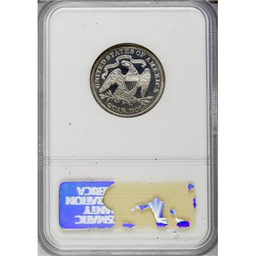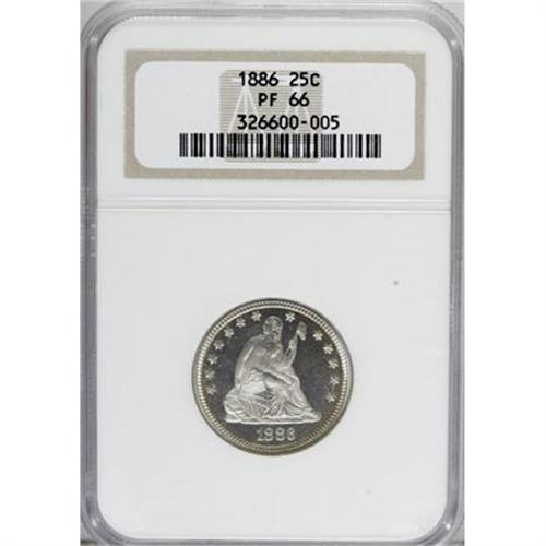 <B>1886 25C PR66 NGC.</B></I> The fields are glassy and deeply reflective, while the frosted devices betray hints of golden color. The resultant cameo effect is noteworthy on the obverse, if subdued by milky color in the fields on the reverse. A lovely Premium Gem proof that is distraction-free. Census: 22 in 66, 17 finer (5/07). <BR><I>From The Vanek Collection.</B></I><BR><BR><b>Shipping:</b> Coins & Currency (<a target="_blank" href="http://www.heritageauctions.com/common/shipping.php">view shipping information</a>)