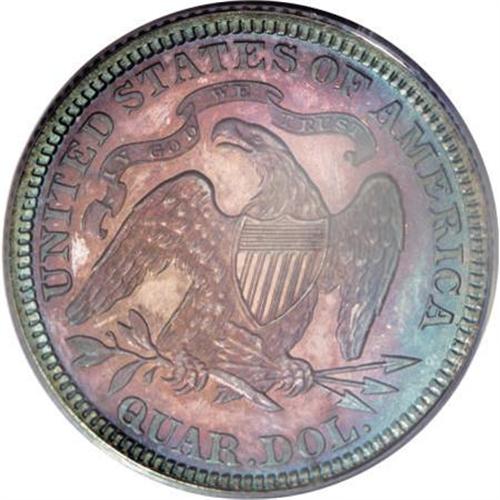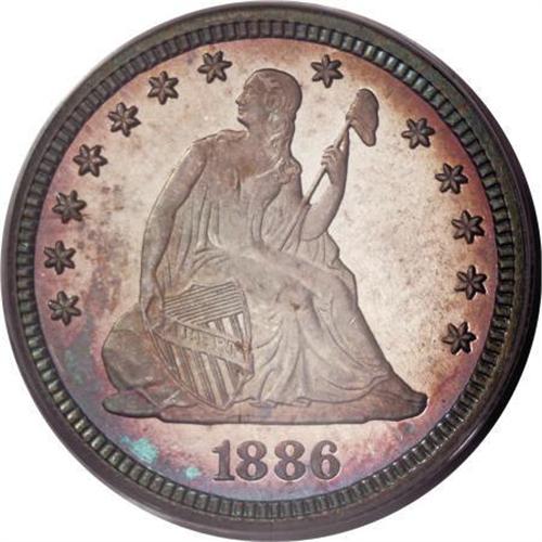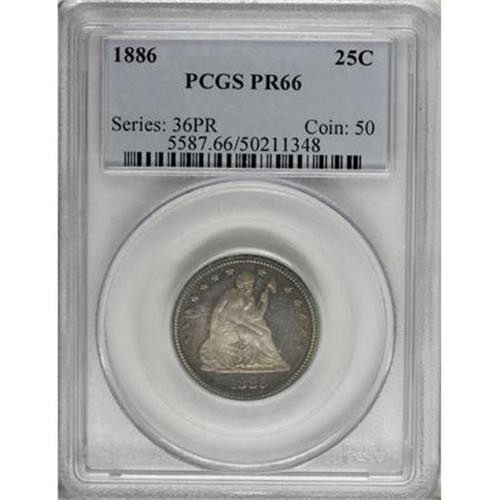 <B>1886 25C PR66 PCGS.</B></I> Champagne-gold toning dominates the obverse, accented with cobalt-blue and lavender around the margins, while the reverse displays a more equitable scattering of the same coloration, only slightly deeper in hue. The design elements are well impressed throughout, and both faces are well preserved. Population: 26 in 66, 11 finer (11/07).<BR><BR><B>Coin Engraver:</B> Christian Gobrecht<BR><BR><b>Shipping:</b> Coins & Currency (<a target="_blank" href="http://www.heritageauctions.com/common/shipping.php">view shipping information</a>)
