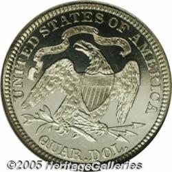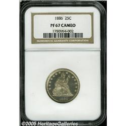 <B>1886 25C PR67 Cameo NGC.</B></I> The popularity of the 1886 is always assured, as only 5,000 business strikes and 886 proofs were produced. The difficulty with which collectors meet when searching for an attractive business strike has placed considerable date pressure on the extant proofs. The rarity of cameo proofs in the loftier states of preservation is apparent from the NGC and PCGS population data. Only 16 examples have been graded by NGC and PCGS combined, with one finer (2/05). This virtually untoned piece offers a stunning contrast between the frosted devices and the mirrored fields. The design elements are exquisitely struck, and the near-pristine surfaces reveal no mentionable marks. This is a coin with super eye appeal that is worthy of a generous bid. Population: 12 in 67, 1 finer (2/05).