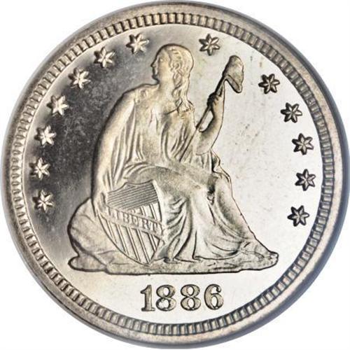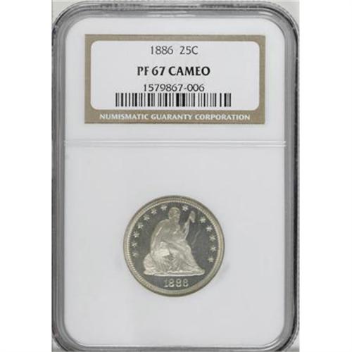 <B>1886 25C PR67 Cameo NGC.</B></I> A fair number of the 886-piece mintage of 1886 proof quarters have apparently survived to the present day, if NGC/PCGS population data are any indication. Even Cameos can be located with some patience and searching, particularly in the lower numerical grades. However, Superb Cameos, such as the coin in this lot, are another story. Outstanding field-motif contrast stands out on the essentially untoned surfaces of both sides, and the exquisitely defined devices further enhance this contrast. Impeccable preservation adds to the overall eye appeal. Census: 15 in 67 Cameo, 2 finer (1/08).<BR><BR><b>Shipping:</b> Coins & Currency (<a target="_blank" href="http://www.heritageauctions.com/common/shipping.php">view shipping information</a>)