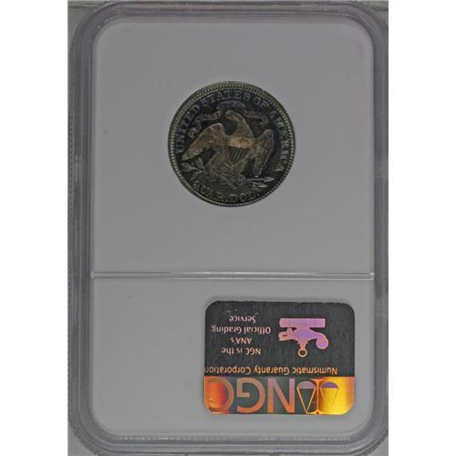 <B>1886<25C> PR67 NGC.</B></I> The 1886 is one of the well-known, low mintage dates from this decade. Only 5,000 business strikes were produced with an additional 886 proofs. At the PR67 level, this piece is tied with 26 others as second finest certified (both NGC and PCGS) with only two finer (8/06). This is a deeply mirrored example that displays deep cobalt-blue toning with purplish-rose centers. Close examination reveals a significant amount of mint frost over the devices, but because of the depth of toning present this effect is unacknowledged.