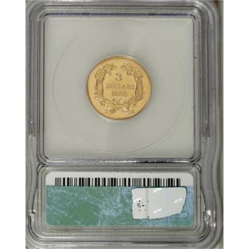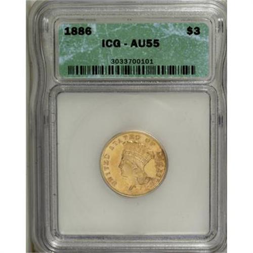 <B>1886 $3 AU55 ICG.</B></I> The three dollar gold denomination continued its death spiral through the 1880s, and in 1886, the business strike mintage was just 1,000 pieces. This Choice AU example shows reflective yellow-orange surfaces with minor highpoint wear and a degree of haze in the fields. Minimally marked and pleasing.<BR><BR><B>Coin Engraver:</B> James B. Longacre<BR><BR><b>Shipping:</b> Coins & Currency (<a target="_blank" href="http://www.heritageauctions.com/common/shipping.php">view shipping information</a>)