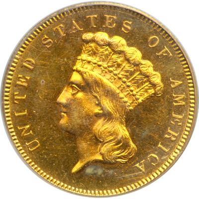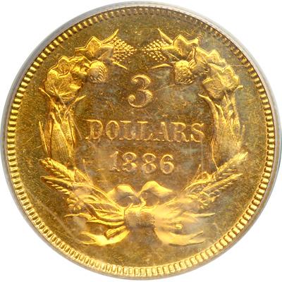 1886 $3 Gold. PCGS graded MS-63. Well struck with lovely golden toning and prooflike wurfaces. Only 1,000 coins minted of this very elusive circulation-strike issue. Collectors of the series will recognize in the period in which this coin was made, many weak strikes predominate. That is why it is a pleasure to report a strike on this '86 $3 with preciseness only now and then found. The vibrant golden color is beautiful. Pop 6; 6 finer with 5 in 64, 1 in 65 (PCGS # 8008) .