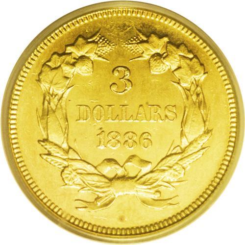 <B>1886<$3> MS60 PCGS.</B></I> There is strictly no sign of wear, but numerous tiny scrapes and abrasions visible under a loupe account for the grade. The eye appeal is higher than might be imagined, however, with much prooflikeness on each side, and unusual but pretty coloration varying from yellow-gold to orange-gold to hazel-gray. Certified in a green-label holder. Population: 2 in 60, 33 finer (9/06).<BR><I>From The Tide Collection.</B></I>