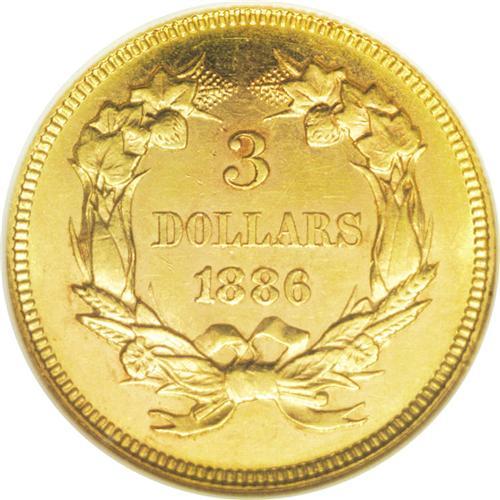 <B>1886<$3> MS61 NGC.</B></I> Although the mintage of this issue from near the series' end was small, like many low mintage issues of the 1870s and 1880s, considerable numbers were set aside. The surfaces boast a moderate cameo effect, although insufficiently so for a designation, and lovely sunset-orange hues are evident. A well struck piece, this attractive example has a few light pinscratches and field ticks on the reverse that define the grade. Interestingly, the Smithsonian Institution National Numismatic Collection lacks an example of this date. Census: 13 in 61, 20 finer (9/06).