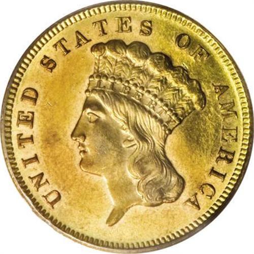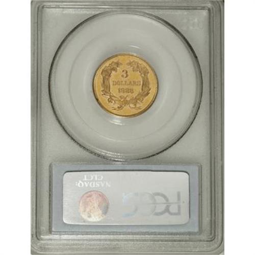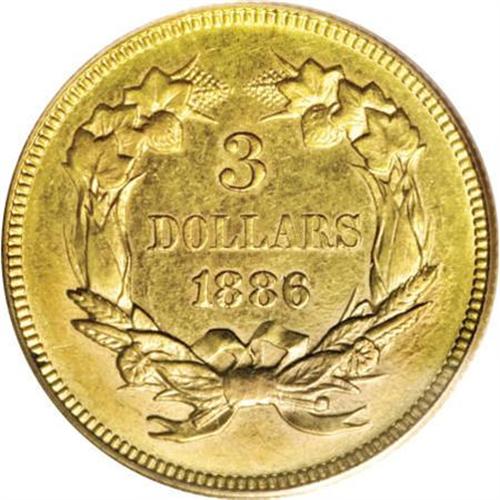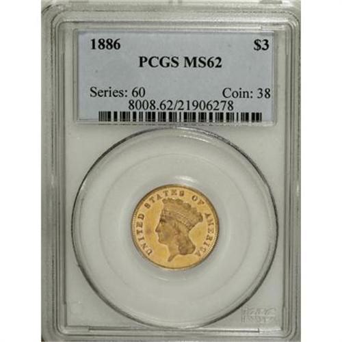 <B>1886 $3 MS62 PCGS.</B></I> An impressive prooflike example of this important issue with sharp design elements, mirrored fields, and wonderful orange-gold coloration. The surfaces are delightful with few blemishes on either side. Although some dates are rarer, the low-mintage of this issue explains its limited availability. Population: 16 in 62, 11 finer (8/07).<BR><BR><B>Coin Engraver:</B> James B. Longacre<BR><BR><b>Shipping:</b> Coins & Currency (<a target="_blank" href="http://www.heritageauctions.com/common/shipping.php">view shipping information</a>)