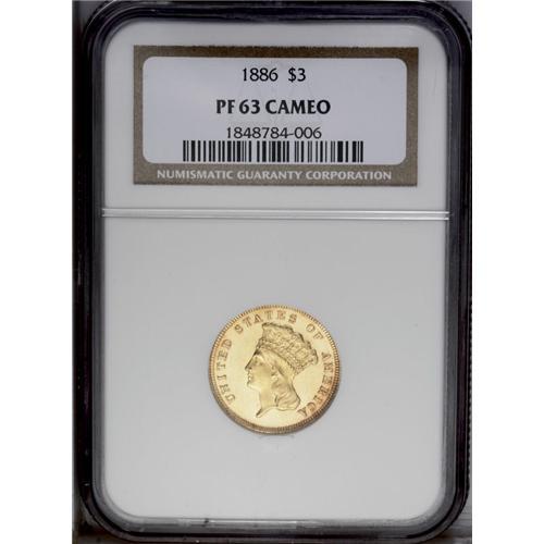<B>1886<$3> PR63 Cameo NGC.</B></I> Both sides of this lovely Cameo proof have light yellow-gold color with evidence of deeper orange toning along the right obverse border. While the fields have a few grade-limiting hairlines and contact marks, it is an excellent appearing piece for the grade. Mintage of the proof gold dollars and three-dollar pieces in the 1880s were considerably higher than for earlier years, or for larger denomination pieces. For instance, 142 examples of this particular date were coined in proof format, along with a large number of prooflike business strikes. Only a few finer examples survive, although there exists a considerable population of higher grade pieces, undoubtedly representing an untold number of resubmissions.