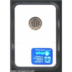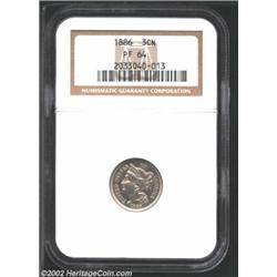 1886 3CN PR64 NGC. Lightly toned with hints of gold and lilac color. A well struck and exquisitely preserved example that appears to be conservatively graded. The third and final proof-only issue within the series. Important notice: We expect to be auctioning lots at the rate of 200-250 per hour. Sometimes eBay Premier live bid software cannot keep up with that pace, so we strongly recommend that you place a realistic proxy bid now as insurance to avoid disappointment. Also please note that all Heritage/CAA lots purchased through eBay Premier carry a 20% Buyer's Premium. Please make sure you read the Terms and Conditions.