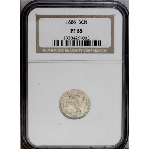 <B>1886<3CN> PR65 NGC.</B></I> A lovely Gem proof example that, while not deeply mirrored, possesses noticeable contrast between the devices and the fields. A few minuscule spots and blemishes, mostly on the obverse, keep it from the Premium Gem proof grade level. Mint records indicate that all 4,290 examples of the denomination struck during the year were proof examples.