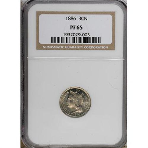 <B>1886 3CN PR65 NGC.</B></I> NGC Census: (311/211). PCGS Population (329/242). Mintage: 4,290. Numismedia Wsl. Price for NGC/PCGS coin in PR65: $525. (#3782)<BR><BR><b>Shipping:</b> Coins & Currency (<a target="_blank" href="http://www.heritageauctions.com/common/shipping.php">view shipping information</a>)