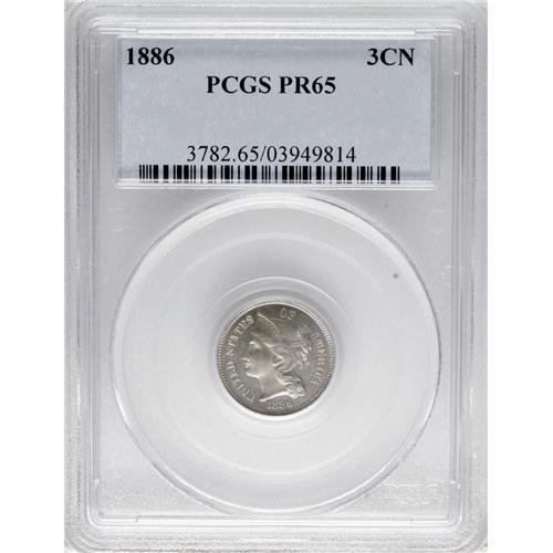 <B>1886 3CN PR65 PCGS.</B></I> PCGS Population (329/242). NGC Census: (620/422). Mintage: 4,290. Numismedia Wsl. Price for NGC/PCGS coin in PR65: $520. (#3782)<BR><BR><b>Shipping:</b> Coins & Currency (<a target="_blank" href="http://www.heritageauctions.com/common/shipping.php">view shipping information</a>)