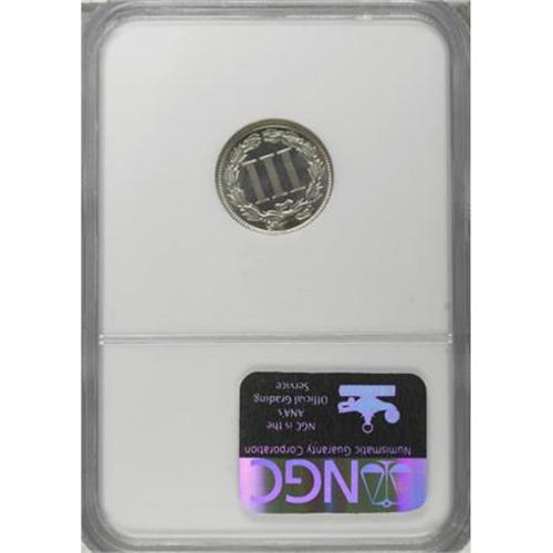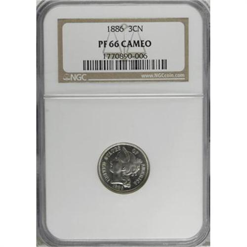 <B>1886 3CN PR66 Cameo NGC.</B></I> An attractive Cameo specimen from the last of three proof-only three cent nickel issues, strongly lustrous and essentially untoned with distinct contrast. Carefully preserved with excellent visual appeal. Census: 17 in 66 Cameo, 11 finer (8/07).<BR><BR><b>Shipping:</b> Coins & Currency (<a target="_blank" href="http://www.heritageauctions.com/common/shipping.php">view shipping information</a>)