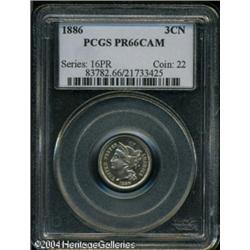 1886 3CN PR66 Cameo PCGS. Fully struck and untoned <B>1886 3CN PR66 Cameo PCGS.</B></I> Fully struck and untoned, with surfaces that are unmarked, save for a tiny planchet flaw (as struck) between the first and second columns of the large Roman numeral III on the reverse. The lightly frosted devices are suitably contrasted against darkly reflective fields. Population: 21 in PR66 Cameo, 12 finer (10/04). <BR><BR><B>Important notice:</B> Heritage usually auctions material at the rate of 200-250 lots per hour. On some occasions eBay Live bid software or the Internet may not be able to keep up with the pace of the auction. We recommend placing a realistic absentee bid now as insurance to avoid disappointment. Occasionally the auctioneer may eliminate or reject an eBay Live bid, and the auctioneer may also reopen a lot after the close of the eBay live bidding (usually because we missed an audience bid), and may reject your bid even if it shows you as the winning bidder. By bidding via eBay Live, you agree that Heritage may award the lot to another bidder at its sole discretion under the circumstances described above or any other reasonable circumstances. Since eBay bids are not shown to us until we open the lot on the floor, we treat those bids just like floor bids. In most cases the floor responds before the eBay bid is presented to us, due to Internet lag time, so for consistency we have made it a policy that floor bids are always considered first over tie eBay live bids. Also please note that all Heritage lots purchased through eBay Live carry a 20% Buyer's Premium. Please make sure you read the Terms and Conditions before you bid. This lot is being auctioned in conjunction with a live floor auction by Heritage Galleries & Auctioneers. All final auction and invoice information will be supplied by Heritage Galleries & Auctioneers, and all other information should be considered preliminary. Lot:5502