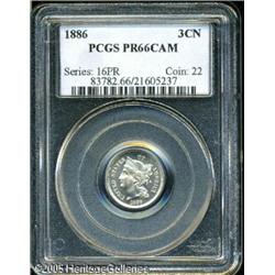<B>1886 3CN PR66 Cameo PCGS.</B></I> Light-gray surfaces and well preserved throughout. The striking details are well brought up overall, with just a touch of softness in liberty's hair below the coronet.<BR><I>From The Mike Jacobson Collection.</B></I> Lot:5766