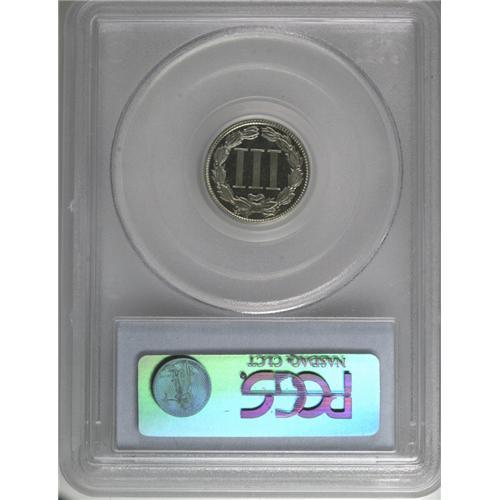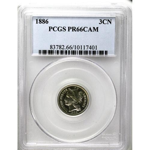 <B>1886<3CN> PR66 Cameo PCGS.</B></I> Only proofs are believed to have been struck in 1886 and 4,290 examples were produced. Cameo pieces, such as this one, are rarely seen when compared to the relative availability of non-cameo coins. This is a brilliant coin that displays shimmering, deeply mirrored fields and significant mint frost over the devices. The otherwise brilliant surfaces show just a bit of light golden streakiness.