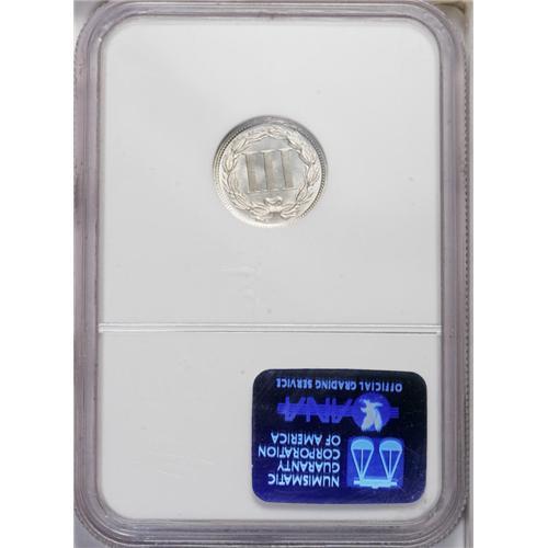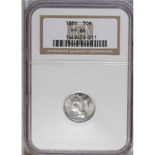 <B>1886<3CN> PR66 NGC.</B></I> A fully brilliant proof with an interesting mix of both reflective and satiny finishes in the fields. Fully defined and quite elusive in finer grades.