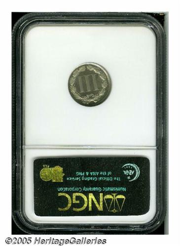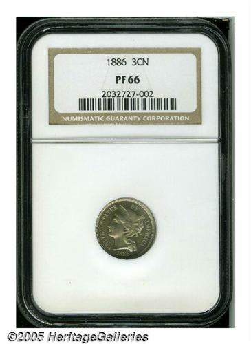 <B>1886<3CN> PR66 NGC.</B></I> Lime and rose hues adorn this immaculate and meticulously struck premium Gem. The 6 in the date is closed and lightly repunched. A proof-only issue, although some pieces (such as the present example) are as satiny as they are reflective.