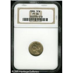 <B>1886 3CN PR66 NGC.</B></I> Speckles of light tan patina roll over bright proof surfaces that have been immaculately well preserved. Boldly struck throughout.<BR><I>From The Mike Jacobson Collection.</B></I> Lot:5765