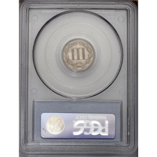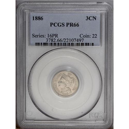 <B>1886<3CN> PR66 PCGS.</B></I> Blended chestnut and cream-gray hues embrace this meticulously struck and undisturbed Premium Gem. The last of three proof-only issues in the series. Liberty's profile is lightly clashed inside the left border of the wreath.