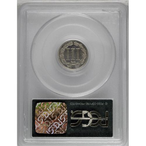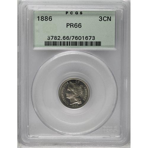<B>1886<3CN> PR66 PCGS.</B></I> This well struck Premium Gem has moderately frosty devices, although the green label holder pre-dates the Cameo designation. A few minuscule gray spots are noted on the portrait. The final proof-only date of the series.