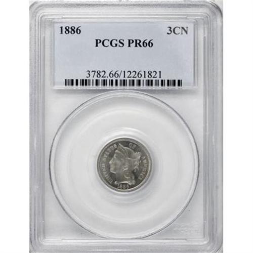 <B>1886 3CN PR66 PCGS.</B></I> A solidly struck and slightly satiny nickel-gray representative, luminous with occasional gold, blue, and lavender accents at the margins. The 1886 is the most available of the proof-only three cent nickel issues, though Premium Gems prove elusive.<BR><I>From The John Stimson, Sr. Collection, Part One.</B></I><BR><BR><B>Coin Engraver:</B> James B. Longacre<BR><BR><b>Shipping:</b> Coins & Currency (<a target="_blank" href="http://www.heritageauctions.com/common/shipping.php">view shipping information</a>)
