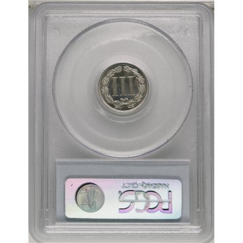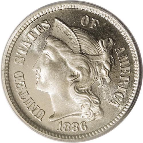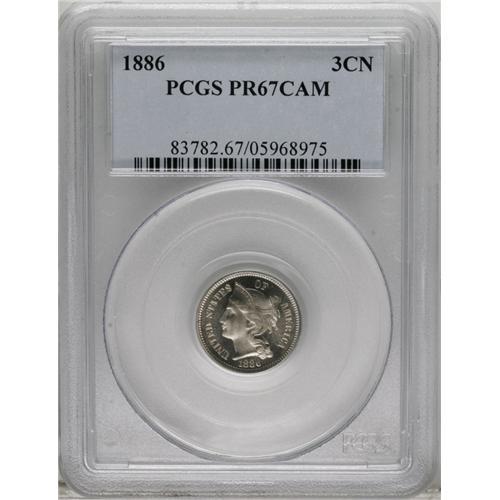 <B>1886 3CN PR67 Cameo PCGS.</B></I> The 1886 three cent nickel piece is a proof-only issue with a reported mintage of 4,290 coins. While PCGS and NGC have certified about 2,000 examples, fewer than 30 coins have been given a PR67 Cameo designation, with none grading higher (3/07). This lovely specimen exhibits a thin veneer of pastel powder-blue and beige-gold color. Mildly frosted motifs stand out against the backdrop of reflective fields, and a sharp strike brings out excellent design detail, including full definition in the lines of the III. Both sides are impeccably preserved. Population: 16 in 67 Cameo, 0 finer (2/07).<BR><BR><b>Shipping:</b> Coins & Currency (<a target="_blank" href="http://www.heritageauctions.com/common/shipping.php">view shipping information</a>)