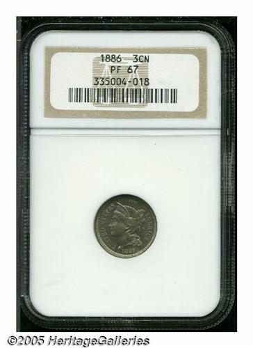 <B>1886<3CN> PR67 NGC.</B></I> Sharply struck and utterly pristine, this beautiful Superb Gem displays luscious rainbow toning on both sides. One of the nicest examples of this issue that we have ever seen. Population: 30 in 67, 1 finer (3/05).